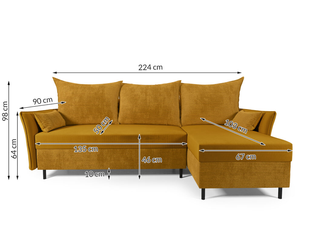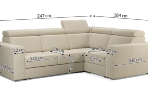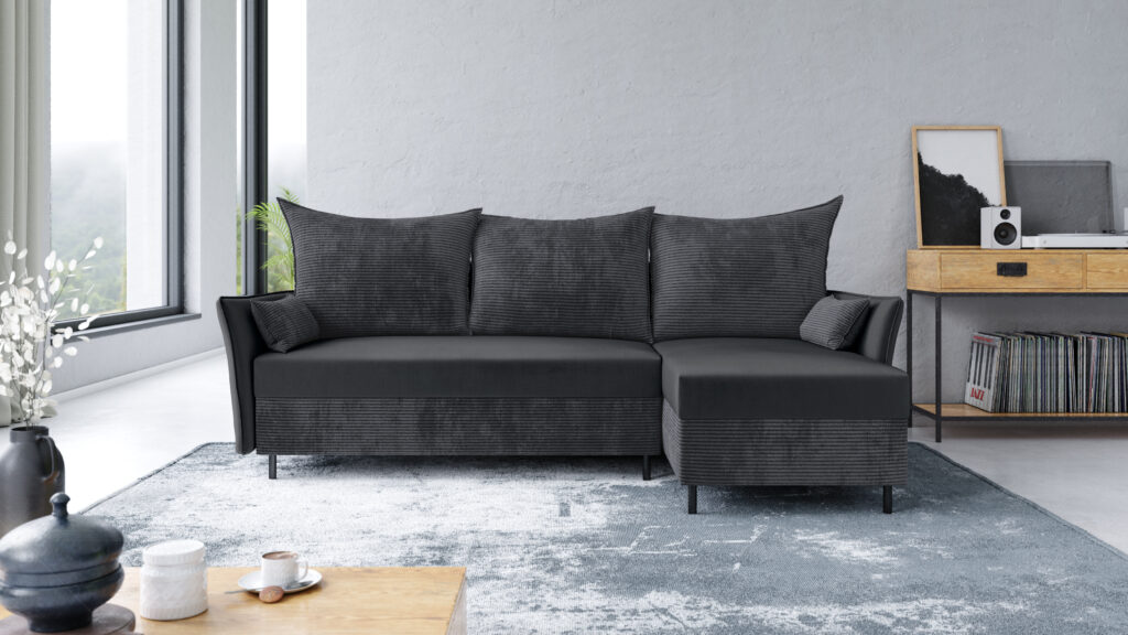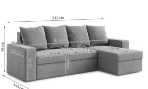 Mebel posiada  pojemnik na pościel oraz duże, wygodne poduszki. Załamane boczki wyróżniają go spośród innych narożników.