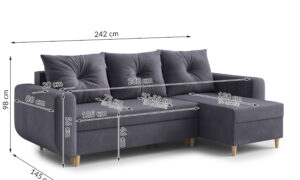 Mebel posiada pojemnik na pościel oraz duże, wygodne poduszki. Załamane boczki wyróżniają go spośród innych narożników.