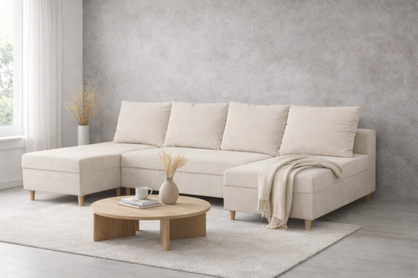 Narożnik VERO wykonany został w kształcie litery U, wielofunkcyjny, który odpowiada na wszystkie oczekiwania domowników. Do produkcji zastosowano szkielet z płyty wiórowej i drewna, wysoko-elastyczną piankę typu T30 oraz sprężynę typu bonell, dzięki czemu siedzisko jest bardzo komfortowe. Mebel posiada pojemnik na pościel oraz duże, wygodne poduszki. Zastosowane w szkielecie elementy z litego drewna podnoszą trwałość i sztywność całej konstrukcji, a to z kolei przełoży się na wieloletnie bezawaryjne użytkowanie .Narożnik jest bardzo łatwy w montażu i demontażu, złożenie go zajmuje zaledwie kilka minut. Narożnik VERO jest meblem wolnostojącym, który możesz umieścić nawet pośrodku pokoju.