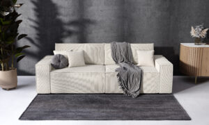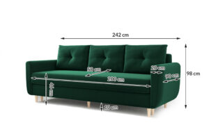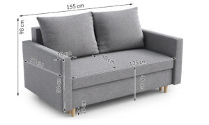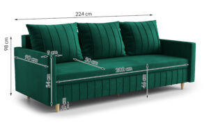 Mebel posiada pojemnik na pościel oraz duże, pikowane wygodne dwie poduszki. Zastosowane w szkielecie elementy z litego drewna podnoszą trwałość i sztywność całej konstrukcji. Kanapa jest bardzo łatwa w montażu i demontażu, złożenie jej zajmuje zaledwie kilka minut.